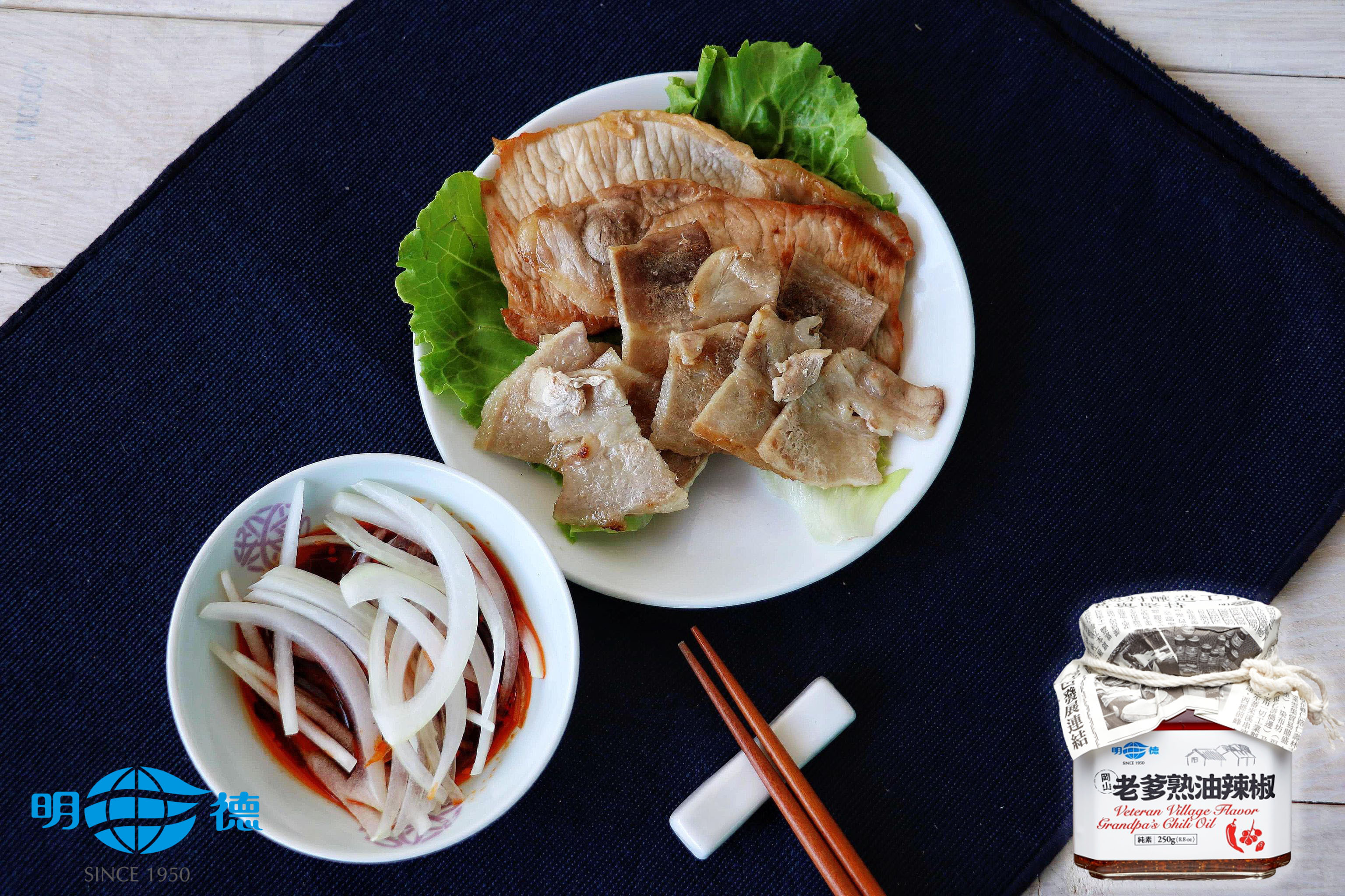 使用明德熱銷商品老爹熟油辣椒加上些許白醋及醬油,搭配口感爽脆的洋蔥,誘人的酸辣滋味保證讓您今年中秋烤肉一口接一口歐!