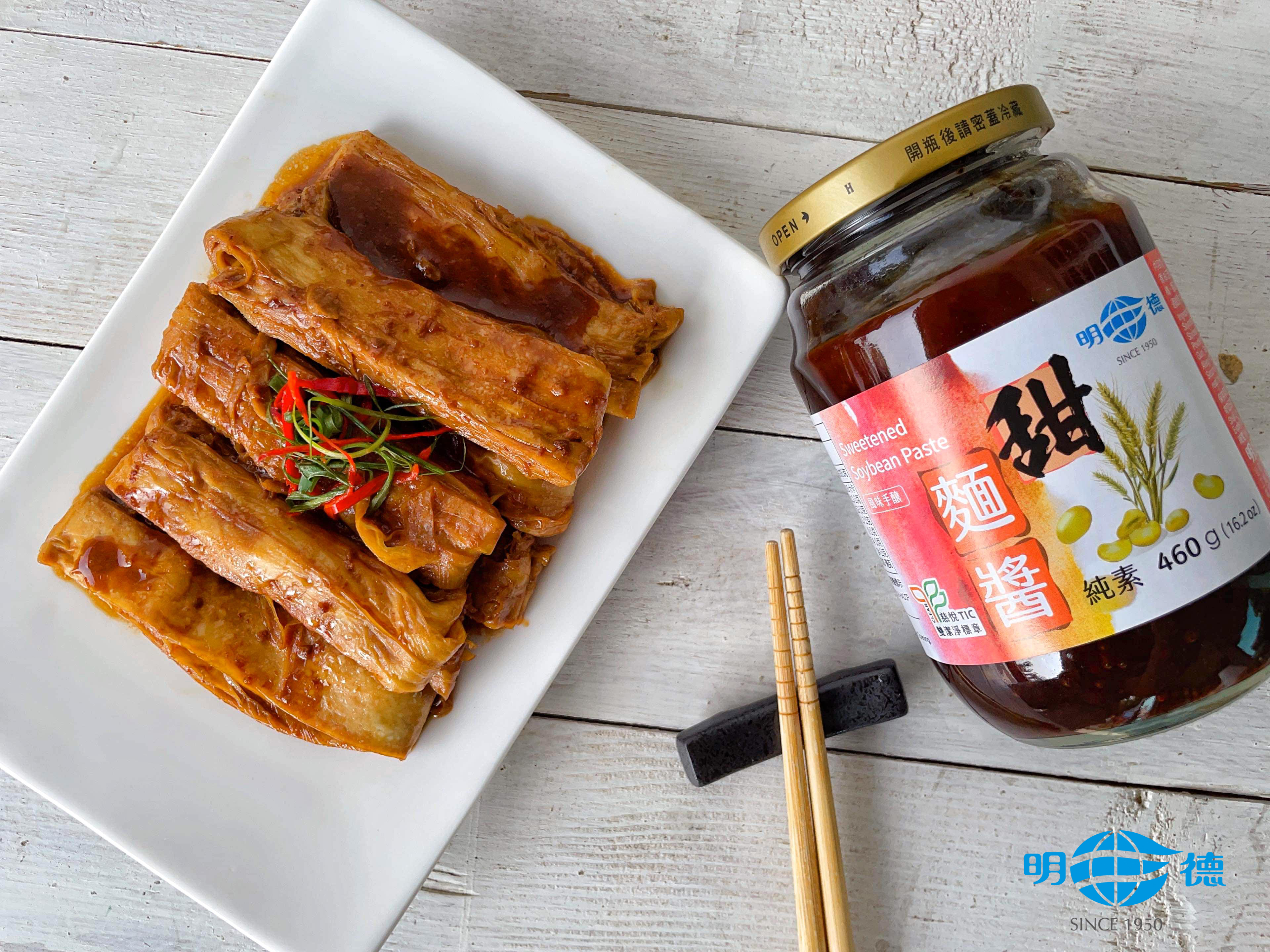 還在煩惱的你,就跟著明德食品一起,用風味手釀甜麵醬製作美味又簡單的【醬燒豆包】吧!